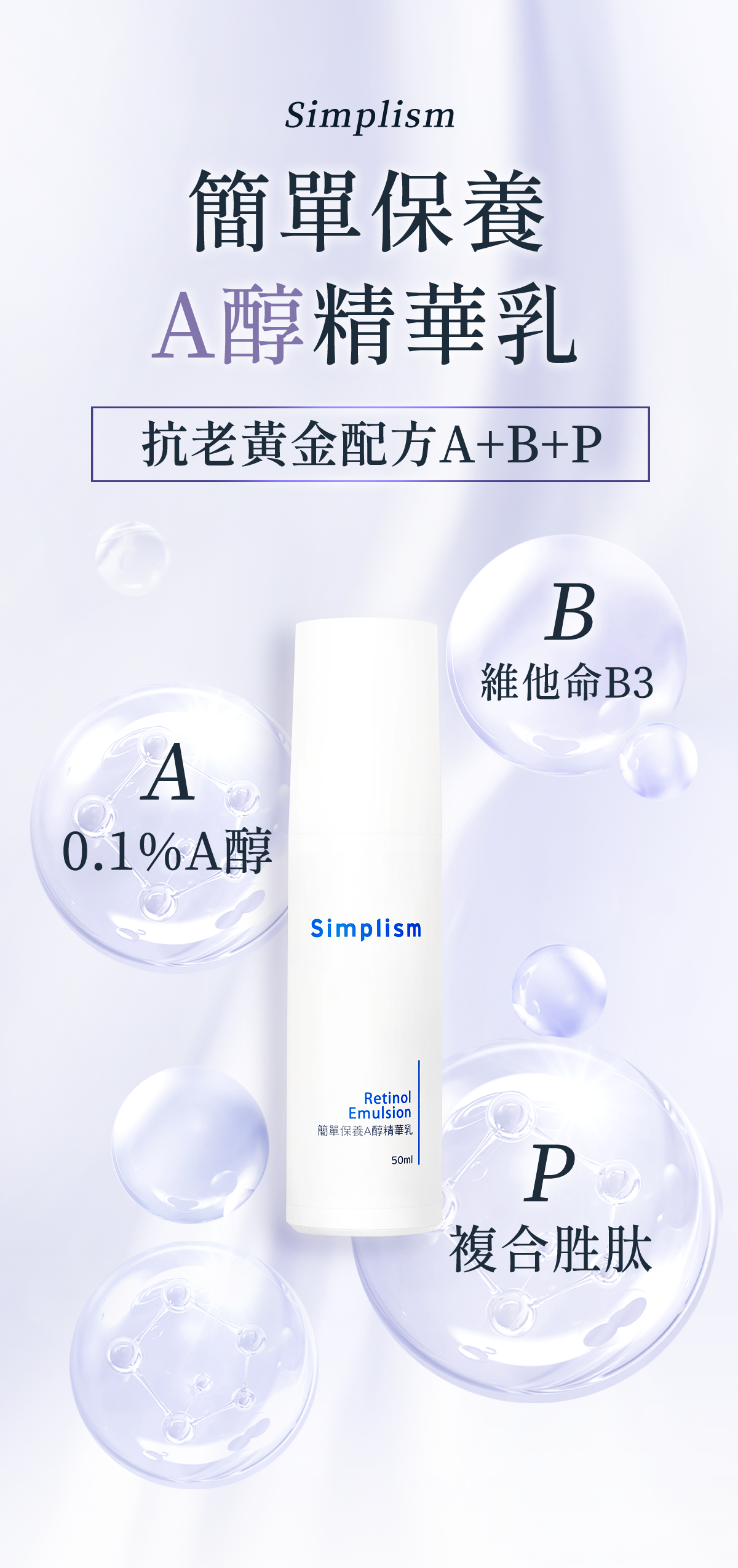 - 主成分:A醇、菸鹼醯胺(維他命B3衍生物)、六胜肽、三胜肽。