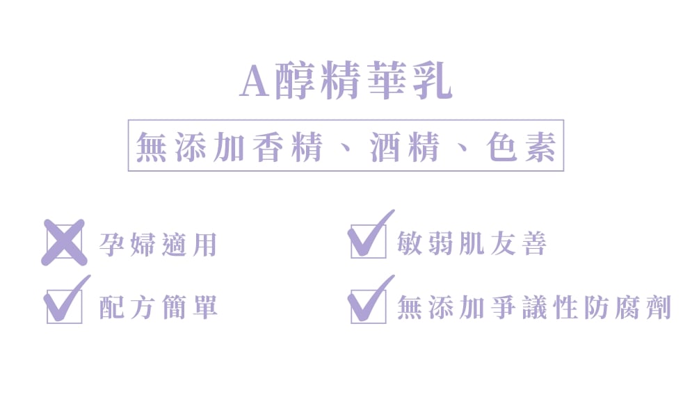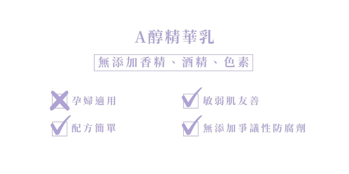 - 孕婦、哺乳中或備孕中的女性,不建議使用含有A醇成分保養品。