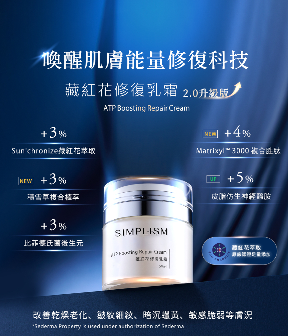 - 主成分:藏紅花萃取、Matrixyl™ 3000 複合胜肽、比菲德氏菌後生元、優格益生元、天然仿生乳化劑、積雪草複合植萃、皮脂仿生神經醯胺。
